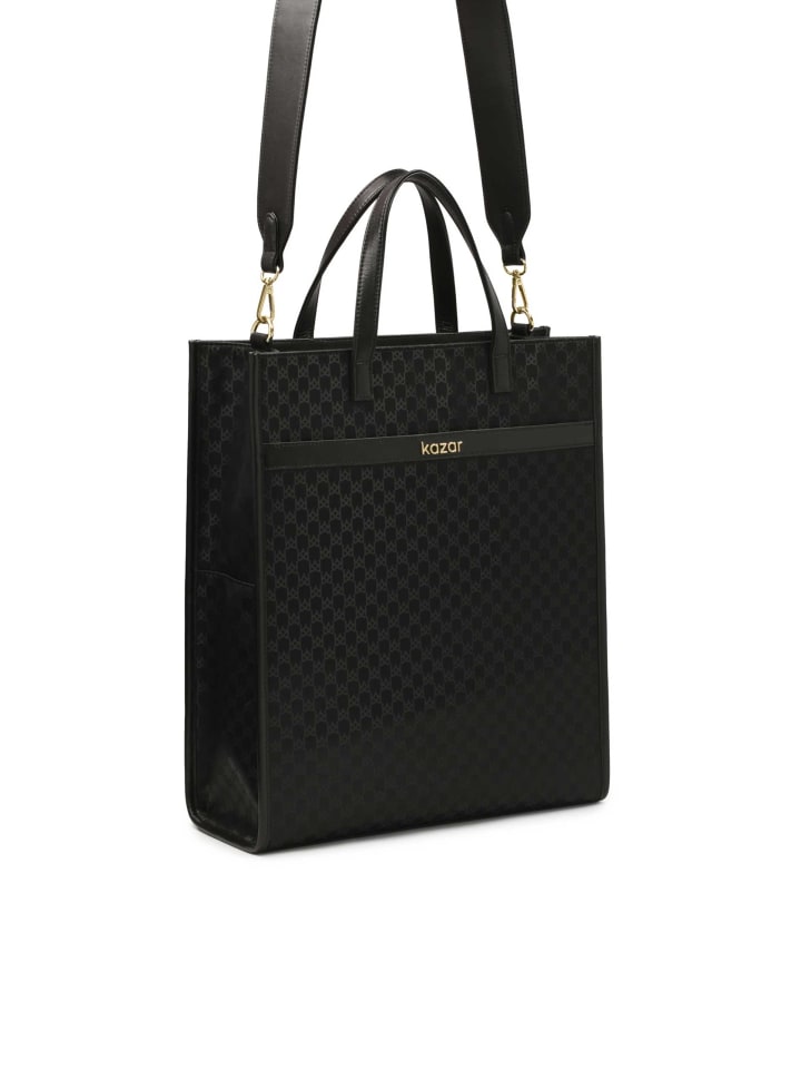 Черная сумка-тоут KAZAR из ткани с монограммой и натуральной кожи - стильный и экологичный аксессуар. Ткань переработана, что подчеркивает заботу бренда об окружающей среде. Благодаря коротким ручкам сумку удобно носить в руке или на предплечье, а съемный регулируемый ремешок позволяет носить ее на плече или через плечо, в зависимости от ваших предпочтений. Золотая окантовка логотипа бренда спереди придает сумке элегантность. Размер сумки - формат А4, что делает ее идеальным вариантом для работы и повседневного использования.
