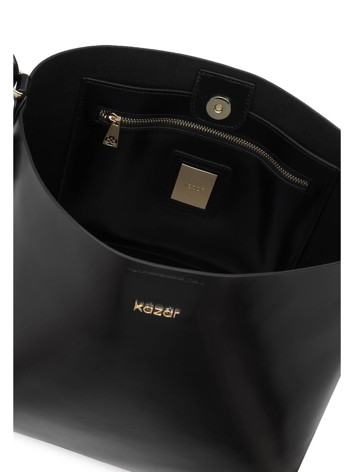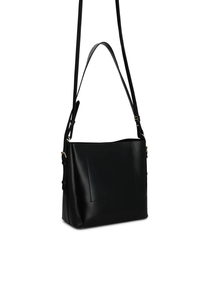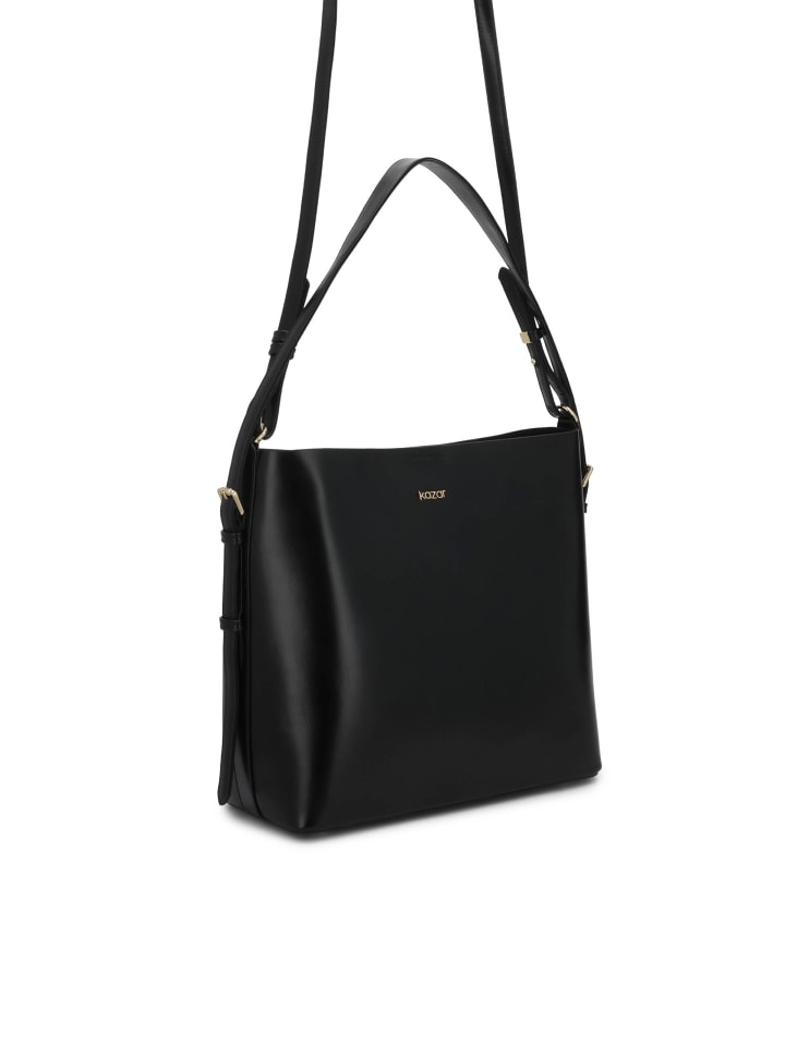Вневременная форма и изысканное мастерство - сумка изготовлена из высококачественной черной натуральной кожи с легким блеском, что еще больше подчеркивает ее элегантность. Классическая, простая форма сумки со слегка закругленными боками делает эту модель идеальным сочетанием функциональности и утонченного стиля. Золотистые детали в виде фурнитуры и пряжек создают красивый контраст с глубокой черной кожей и подчеркивают ее роскошный характер. Благодаря регулируемому ремешку сумку удобно носить на плече или через плечо. Это идеальный выбор для женщин, которые ищут универсальный, но стильный аксессуар - идеально подходящий для работы и вечерних нарядов.