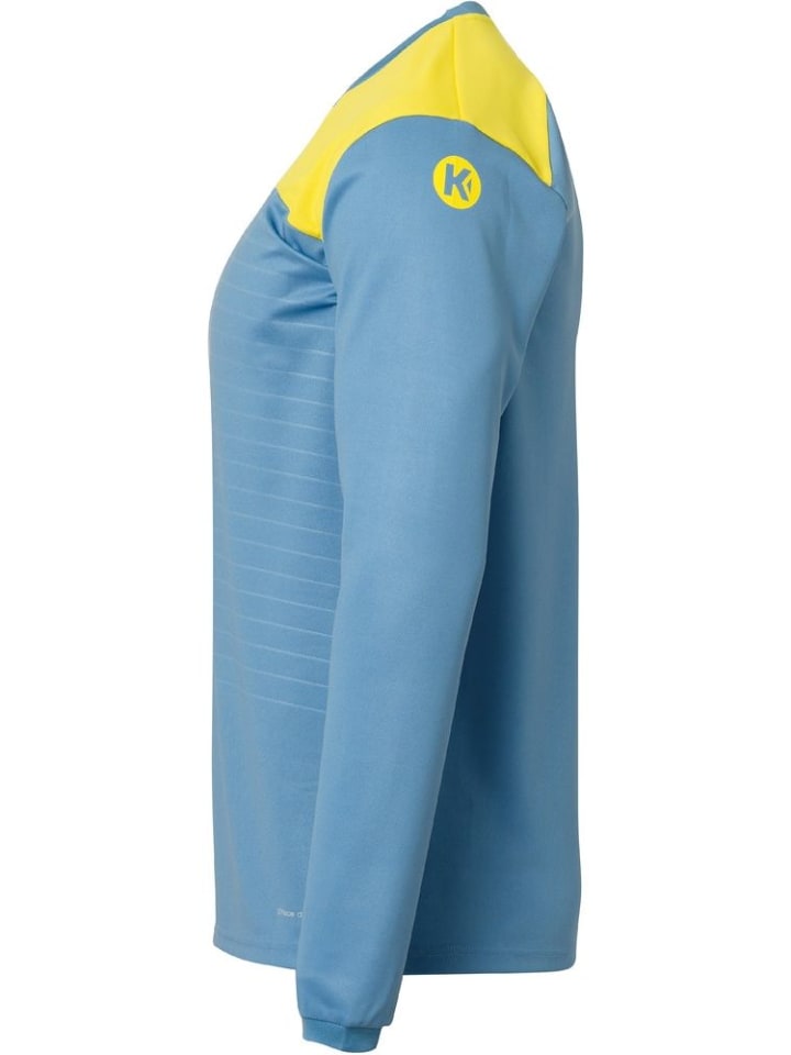 Круглый вырез с лентой на воротнике - Техничный дизайн спереди и сзади - Рельефные линии спереди - Эластичные принты Kempa и K-Label - Ребристые манжеты на рукавах и воротнике Материал: 100% полиэстер