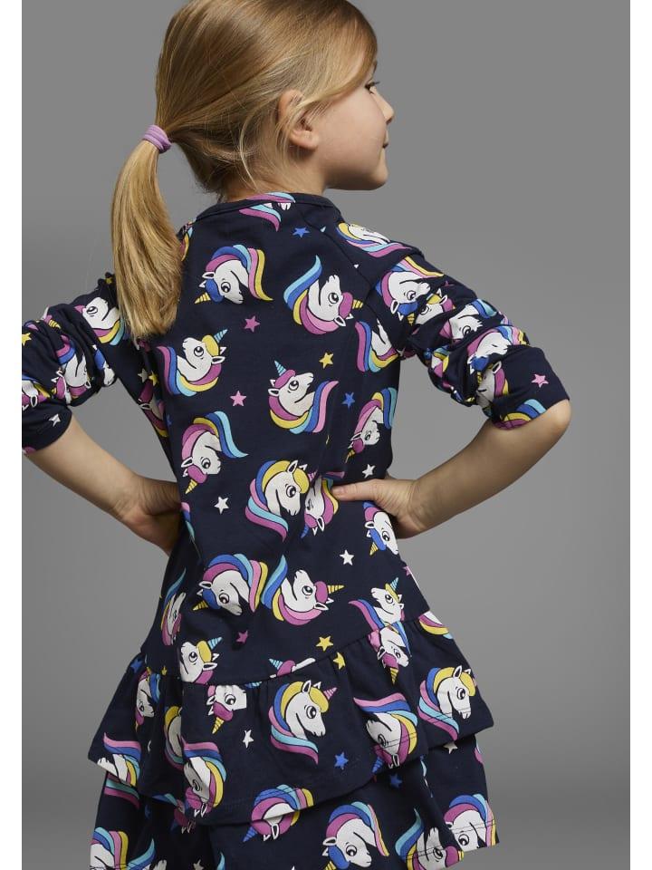 Платье Kidsworld с рисунком единорога. Длинные рукава и круглый вырез. Оборки по подолу. Свободный крой. Удобный и слегка эластичный трикотаж.