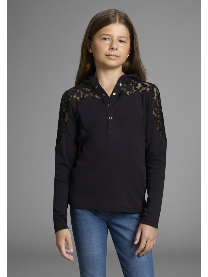 Модная толстовка с капюшоном от KIDSWORLD с кружевными деталями. Длина до бедер, стандартная ширина. Длинные рукава. Рубашка также застегивается на пуговицы. Верх выглядит особенно нарядно благодаря красивому кружеву.