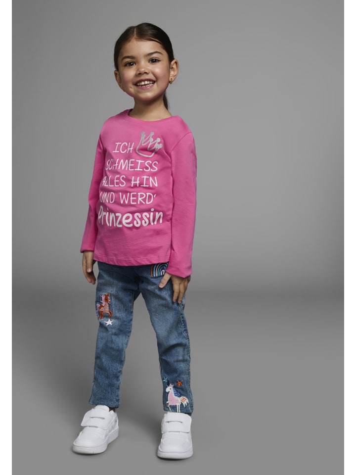 Модная рубашка с длинными рукавами от KIDSWORLD с блестящей отделкой. Длина до бедер, стандартная ширина и стильный принт. Верх выполнен из гладкого трикотажа для комфорта и свободы движений.