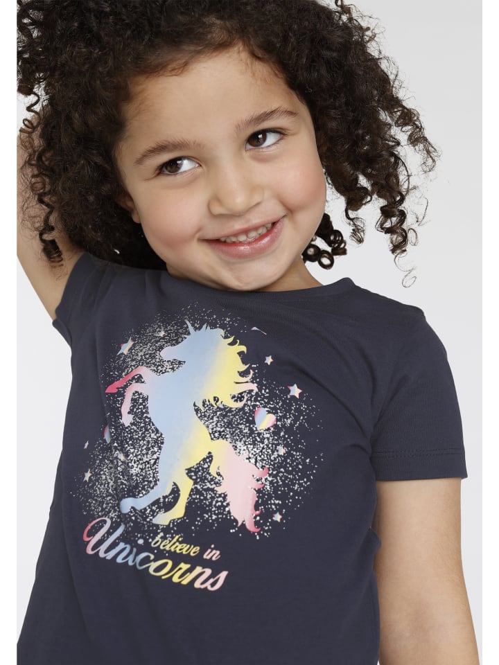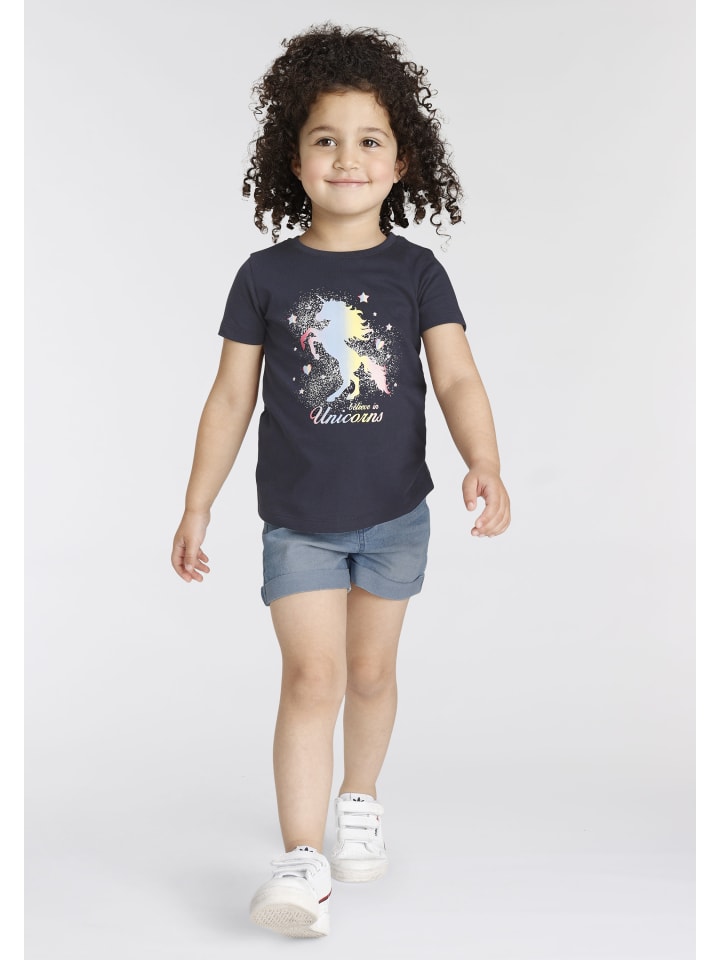 Модная футболка от KIDSWORLD с блестками. Длина до бедер, стандартная ширина, стильный принт. Верх мягко облегает фигуру благодаря эластичному трикотажу.