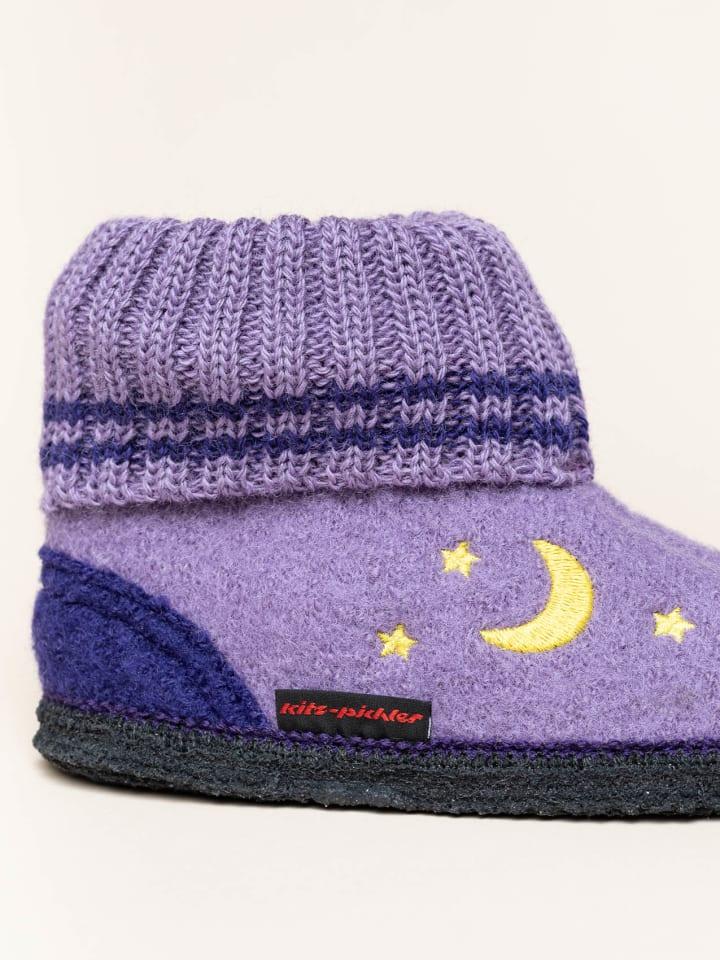 Эти гибкие тапочки из тонкой шерсти с рисунком луны и звезд заставят сердца биться чаще. Тонкая трикотажная манжета позволяет легко надевать и снимать их, обеспечивая оптимальную поддержку для любой формы стопы. Войлочная подошва, пропитанная латексом, гарантирует надежное сцепление с любой поверхностью. Если детские тапочки испачкаются, их можно стирать в стиральной машине при температуре 30°C.