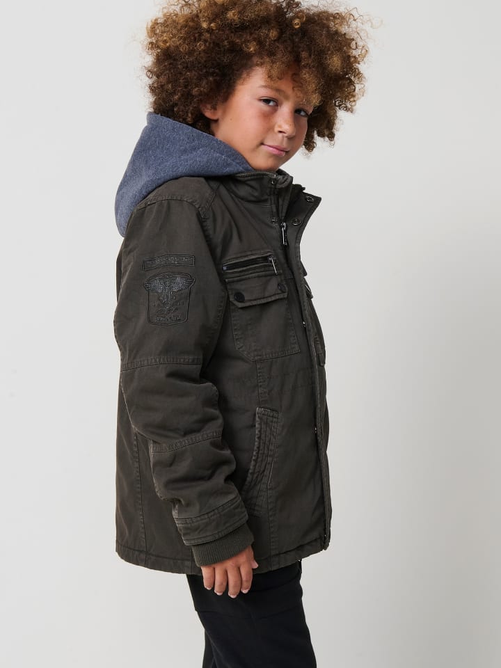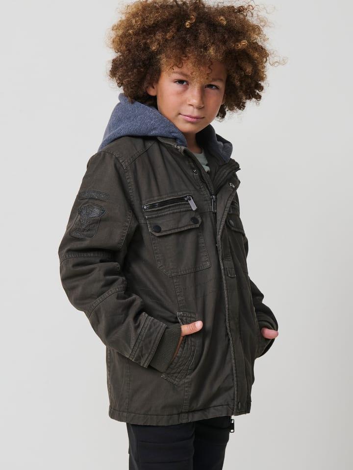 Детская хлопковая куртка с эффектом стирки оливково-зеленого цвета. Съемный капюшон из хлопкового флиса. Застежка на молнию спереди. Состав: 100% полиэстер