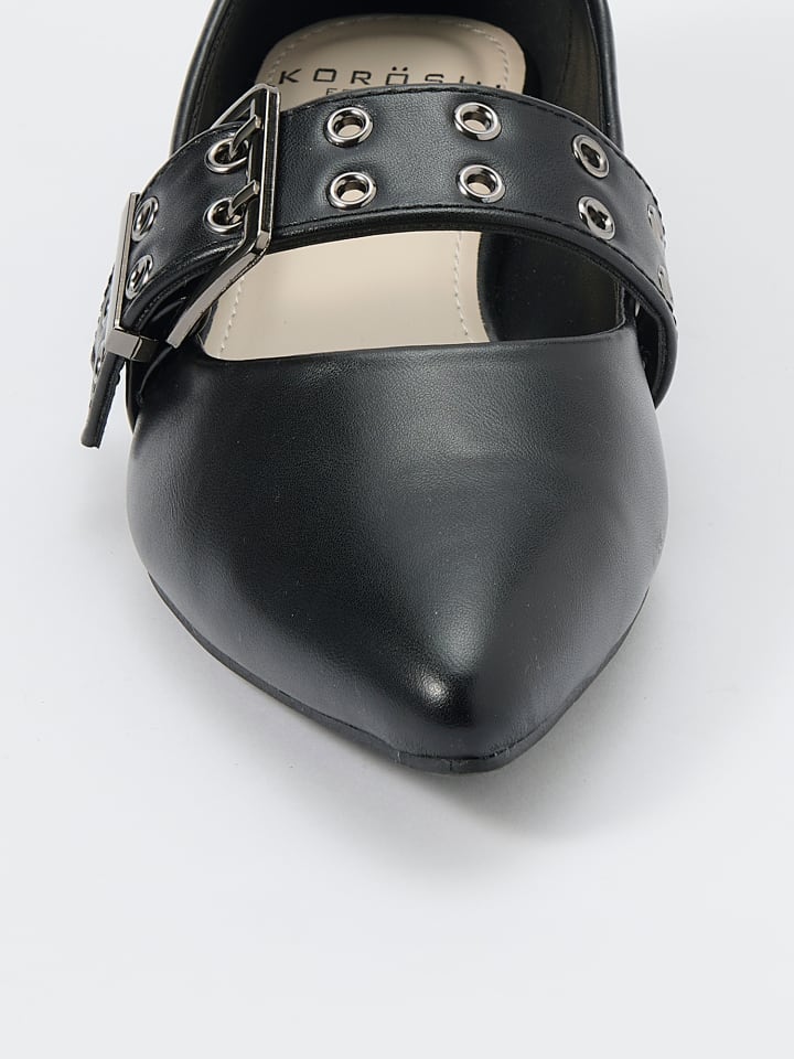 Балетки на плоской подошве с имитацией кожи, удлиненным носком, декоративной пряжкой и металлическими деталями. Состав: 100% полиуретан