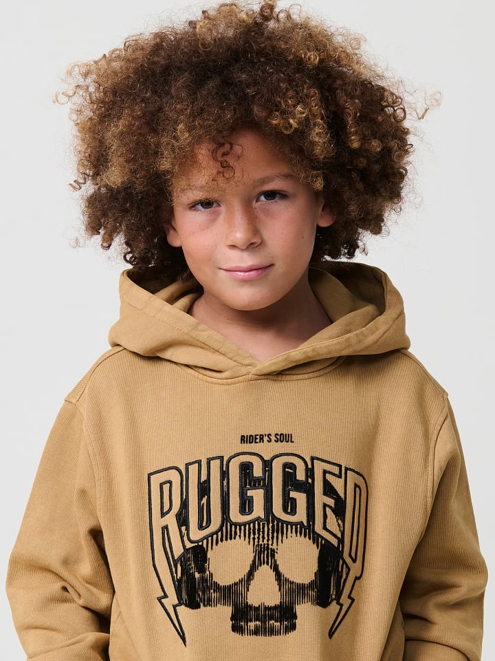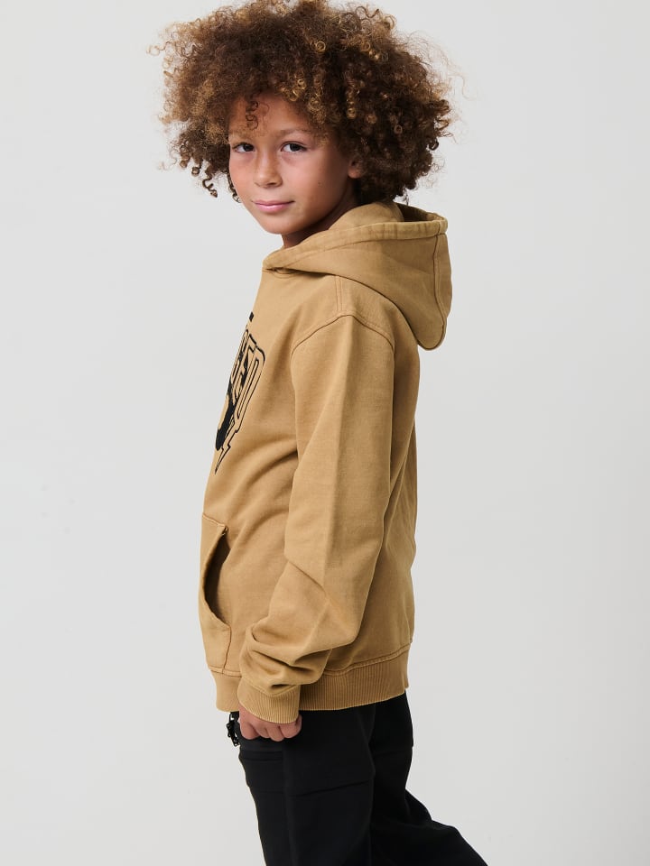 Детская толстовка из мягкого чесаного хлопка горчично-желтого цвета с капюшоном, длинными рукавами и карманом-кенгуру спереди. Состав: 100% хлопок.