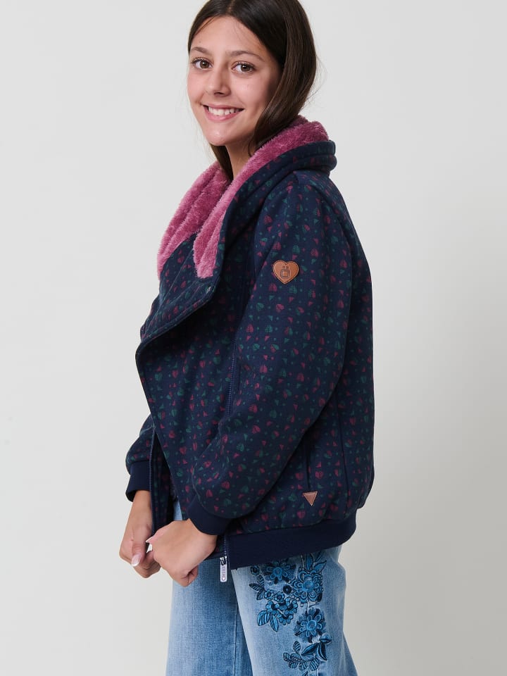 Свитшот для девочек из эластичного хлопкового флиса с темно-синим микропринтом разных цветов, капюшоном на темно-розовой подкладке и длинными рукавами. Состав: 100% хлопок