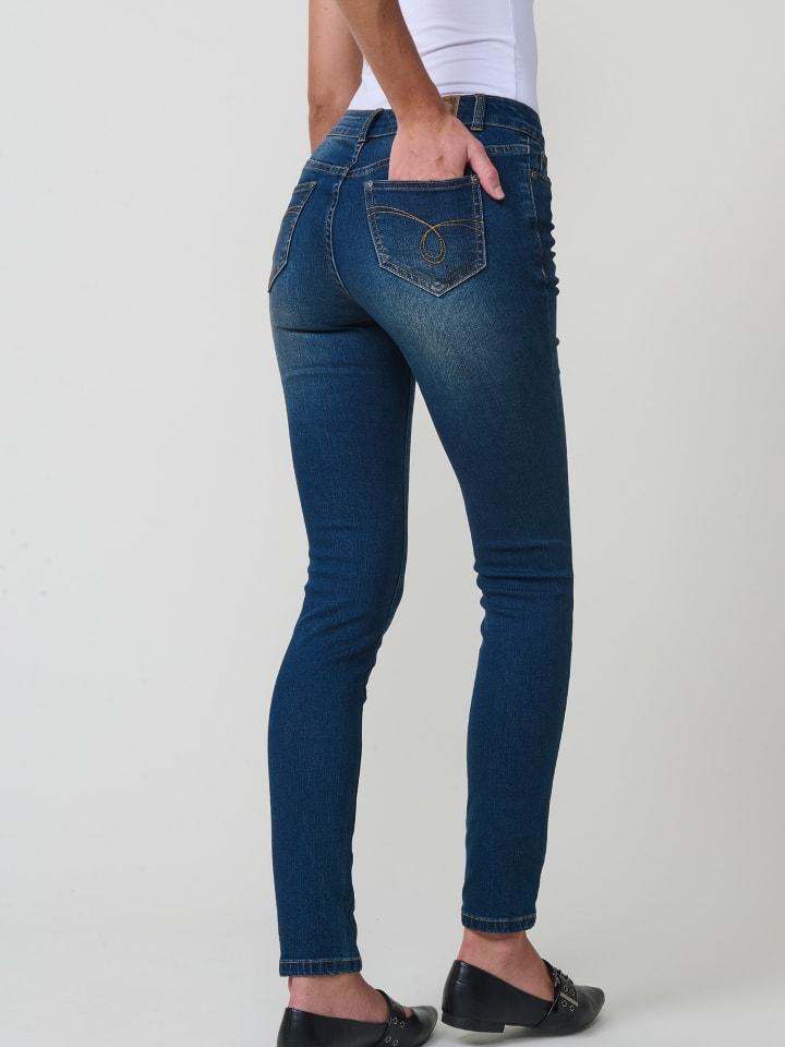 - Синие джинсы-стрейч, выбеленные, средняя посадка, пять карманов, молния.