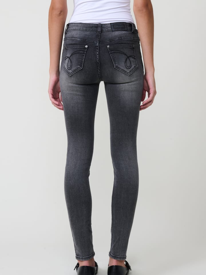 Джинсы эластичные, черные, стираные. Узкий крой, средняя посадка, пять карманов. Застежка на молнию и металлическую пуговицу. Металлическая пластина с логотипом Koroshi спереди. Состав: 75% хлопок, 23% полиэстер, 2% эластан.