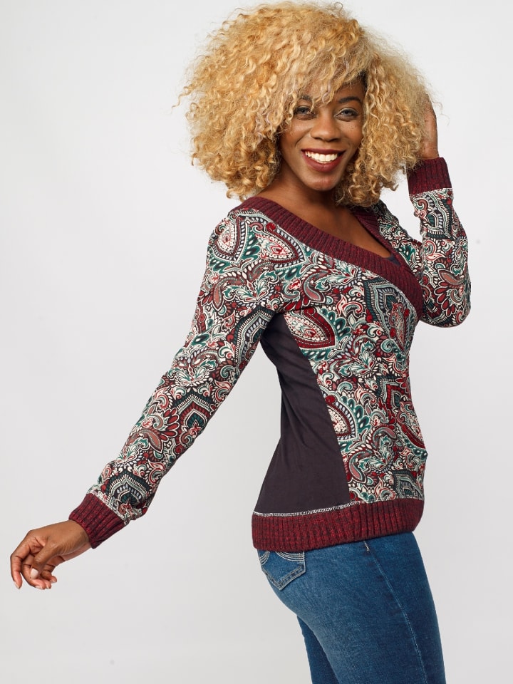 Футболка с кашемировым принтом, классический крой. Перекрещивающийся вырез горловины из трикотажа. Длинные рукава. Трикотажная отделка. Состав: 100% хлопок