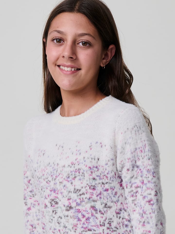 Мягкий трикотажный джерси для девочек, цвет "сырой", длинные рукава, резинка на круглой горловине, закругленный низ, жаккардовый узор, резинка на манжетах и подоле. Состав: 70% полиамид, 30% акрил