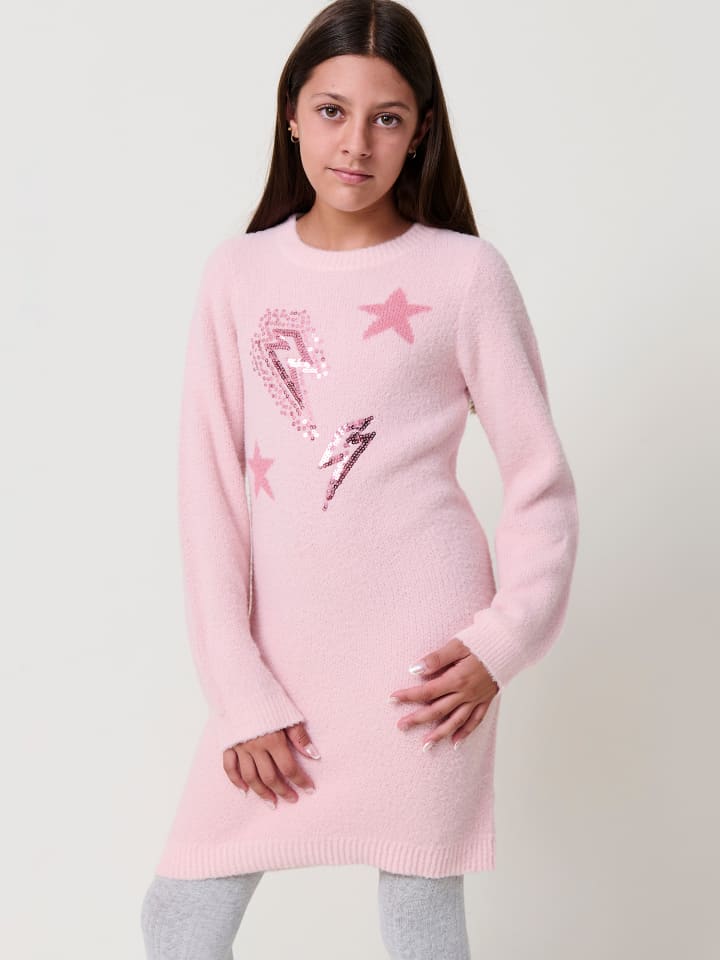 Платье для девочки из мягкого трикотажа, розового цвета, с длинными рукавами, круглым ребристым вырезом, жаккардовым узором с розовыми пайетками, ребристыми манжетами и подолом. Состав: 70% полиамид, 30% акрил.
