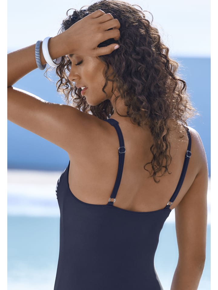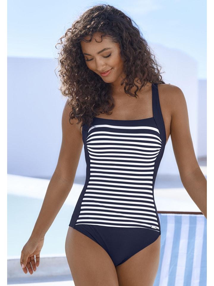 Красивый купальник Lascana с полосатым рисунком в морском стиле. Мягкие вшитые чашечки и резинка под грудью спереди. Бретельки регулируются по длине. Удобный материал с переработанным полиамидом.