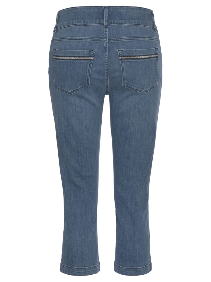 Джинсы-капри от Lascana. Однотонный дизайн. Пояс на двух пуговицах и молнии. Модель с пятью карманами и контрастной декоративной лентой на декоративных карманах. Приталенный крой. Легко комбинировать. Удобный, эластичный деним.