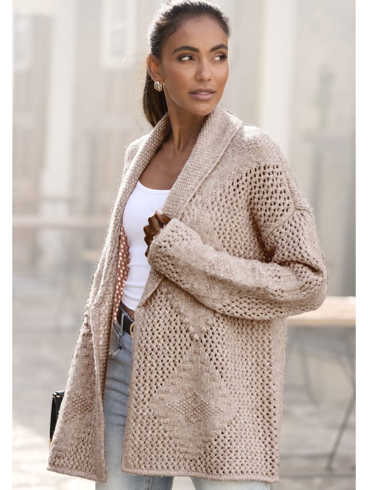 Кардиган от Lascana. С шалевым воротником и вязаным узором. Без застежки. Спущенные плечи. Уютный трикотаж. Длина по спинке около 72 см.