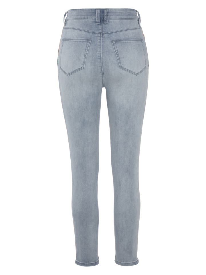 Джинсы до щиколотки от Lascana. Разноцветная вышивка сбоку. Прямой подол с небольшим разрезом. Высокая посадка. Модель с пятью карманами. Эластичный деним.