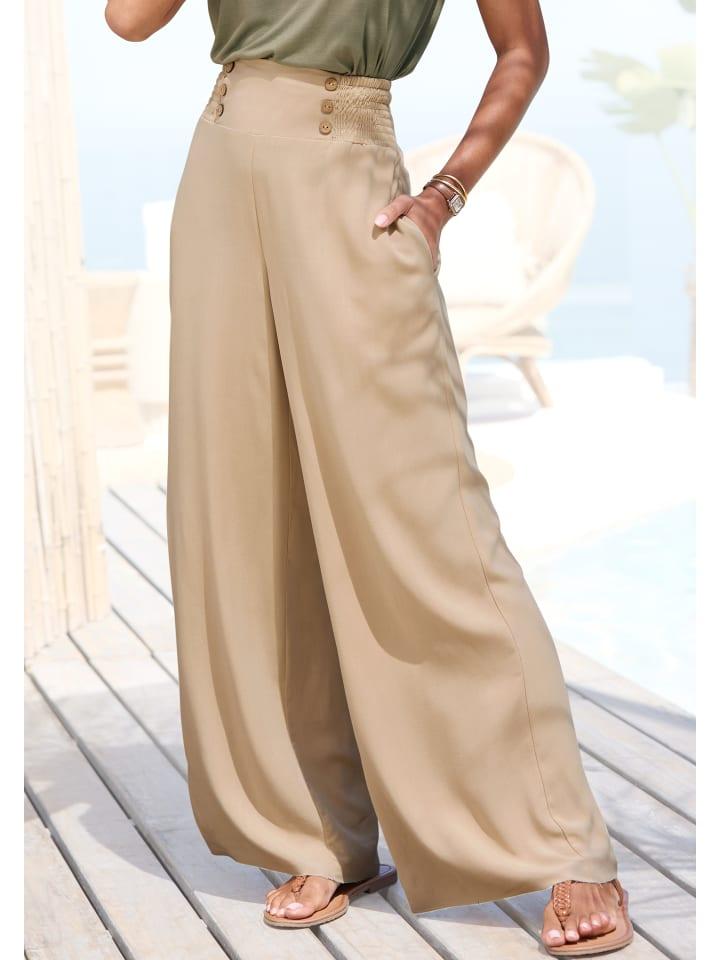 Элегантные брюки-палаццо Lascana с широкими брючинами длиной до пола. Модные декоративные пуговицы с имитацией дерева и присборенный пояс. Практичные карманы в боковых швах. Воздушный, комфортный тканый материал из вискозы.