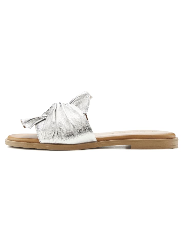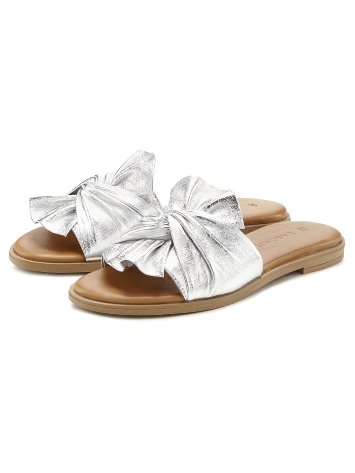 Мюли Lascana с большим бантом. Широкий блестящий металлический ремешок. Стелька с легкой подкладкой для комфортного ношения. Идеальный вариант для следующего лета - с платьями, юбками или шортами. Верх из овчины. Подкладка из свиной кожи. Стелька из коровьей кожи. Синтетическая подошва.