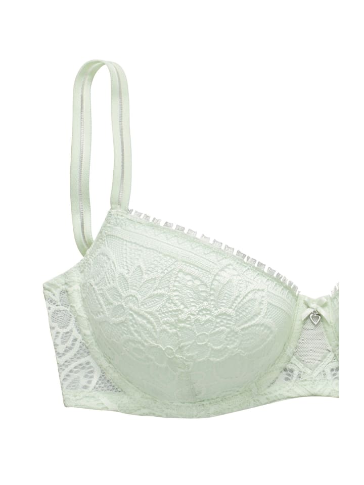 Красивый бюстгальтер на косточках с нежным декоративным бантиком и симпатичным сердечком по центру спереди. Изготовлен из цветочного жаккардового кружева и декоративной сетчатой ткани. Индивидуально регулируемые бретели и застежка на спине. Доступны соответствующие трусики из той же серии. С кружевом, которое содержит часть переработанного полиамида. Нижнее белье. Соблазнительное белье. Кружевное белье. Романтичное белье. Игристое белье. Изготовлен из 72% полиамида, 20% полиэстера, 8% эластана.