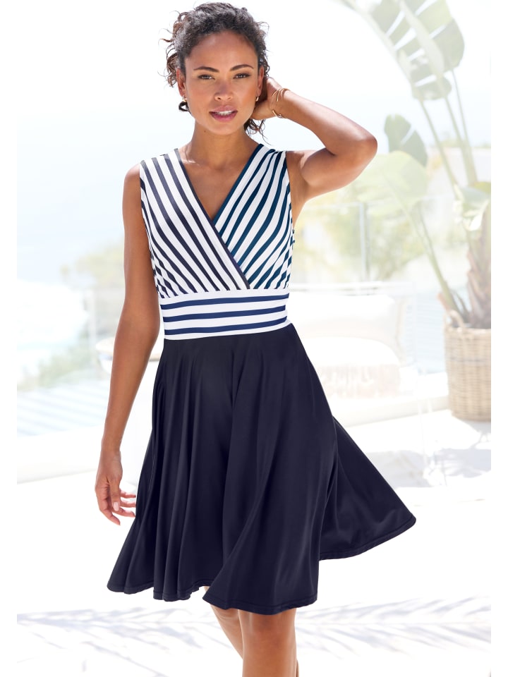 Пляжное платье в морском стиле от Lascana с верхом-запахом. V-образный вырез спереди и сзади. Расклешенная юбка. Верх с принтом, однотонная юбка. Ткань джерси, не требующая глажки.