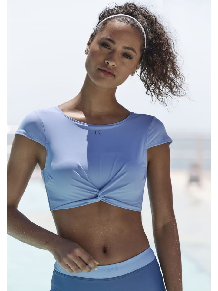 Однотонный укороченный топ от Lascana Active. Короткие рукава, круглый вырез и узел спереди. Мягкие съемные чашечки. Идеально подходит для занятий спортом. Комфортное качество благодаря переработанному полиамиду.