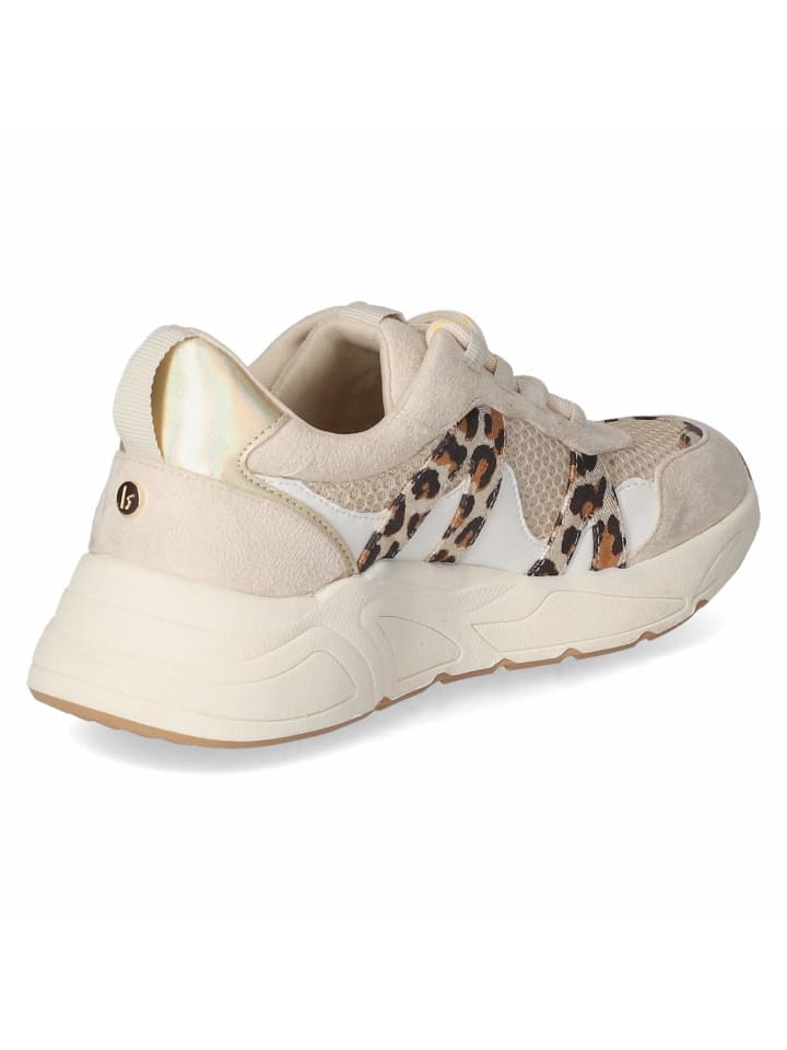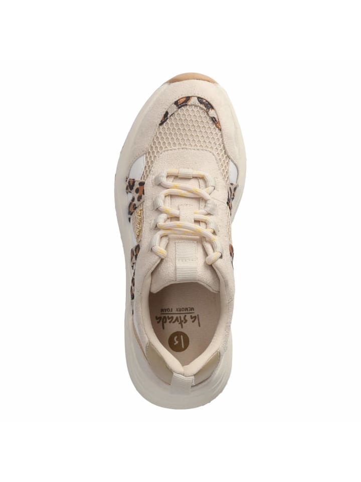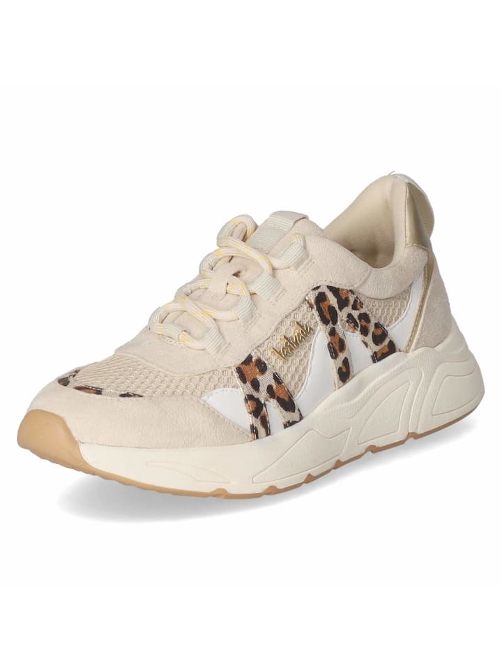 Бежевые женские низкие кроссовки La Strada из смеси текстиля и синтетического материала сочетают в себе стиль и комфорт. Золотистые акценты и фирменные детали придают кроссовкам изысканный вид. Детали с анималистичным принтом добавляют модных акцентов. Усиленные носок и пятка обеспечивают дополнительную устойчивость и защиту. Практичная система облегчения надевания и дышащая сетка обеспечивают высокий уровень комфорта. Мягкий бортик и стелька из пены с эффектом памяти обеспечивают комфорт, а гибкая нескользящая подошва - надежное сцепление. Кроссовки, которые одновременно функциональны и модны.