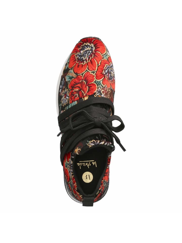 Цветочная роскошь встречается с вневременной спортивностью: кроссовки La Strada Low черного цвета с ярким цветочным узором и задником, имитирующим кожу рептилий. Легкий текстильно-синтетический материал обеспечивает удобную посадку, а круглый носок и гибкая, нескользящая подошва обеспечивают комфортную ходьбу. Благодаря язычку-застежке, кроссовки легко надеваются без застежки, а усиленная пятка обеспечивает поддержку. Удобная съемная стелька с текстильной стелькой обеспечивает поддержку при длительной носке и легко заменяется. Размер соответствует заявленному; различные градиенты рисунка подчеркивают индивидуальный характер модели. Эти изысканные кроссовки подойдут как для особых случаев, так и для элегантных повседневных образов. Модный совет: Черные брюки-кюлоты и атласная майка создают повседневный, но элегантный образ.