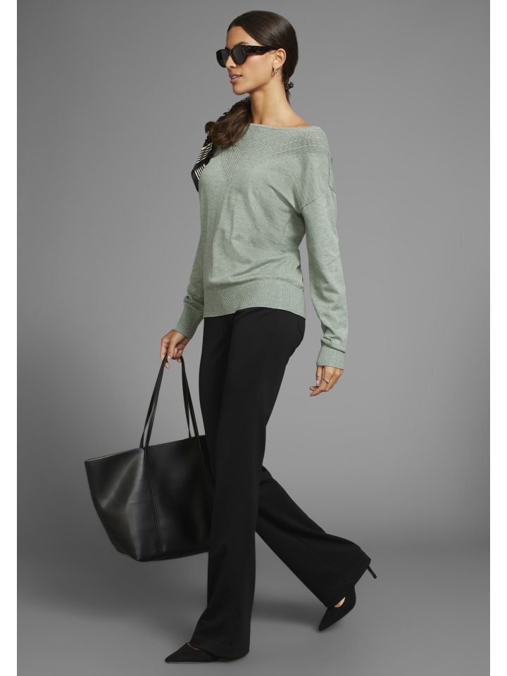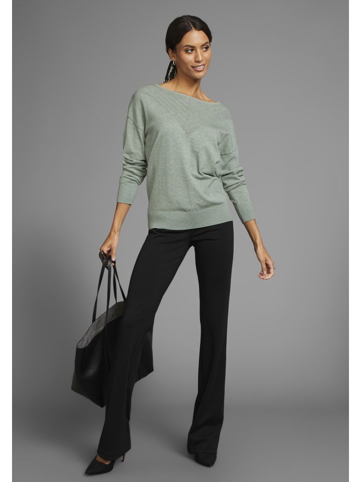Женский свитер с круглым вырезом от Laura Scott с ажурным узором, который легко комбинировать. Он имеет широкий крой до бедер. Длинные рукава. Верх из тонкой вязки приятен на ощупь и удобен в носке.