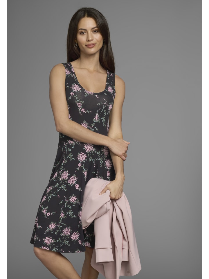 Игривое трикотажное платье от Laura Scott. Модный принт с цветочными мотивами по всей длине. Бретели. Юбка плиссированной формы. Комфортная ткань с добавлением эластичности.