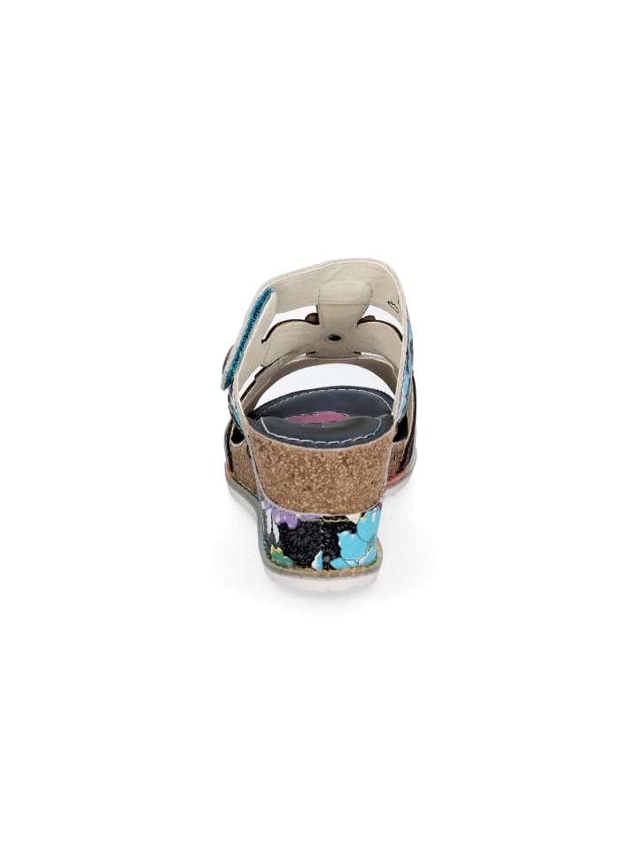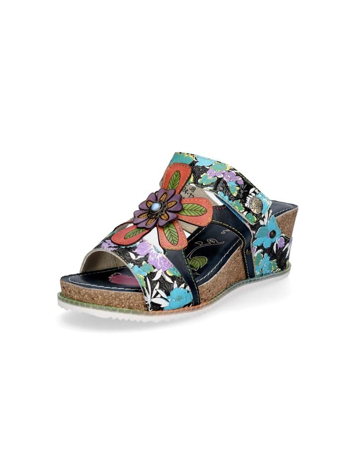Женские кожаные мюли Laura Vita в джинсовой ткани с цветочным декором, застежкой на липучке и танкеткой высотой 6 см.
