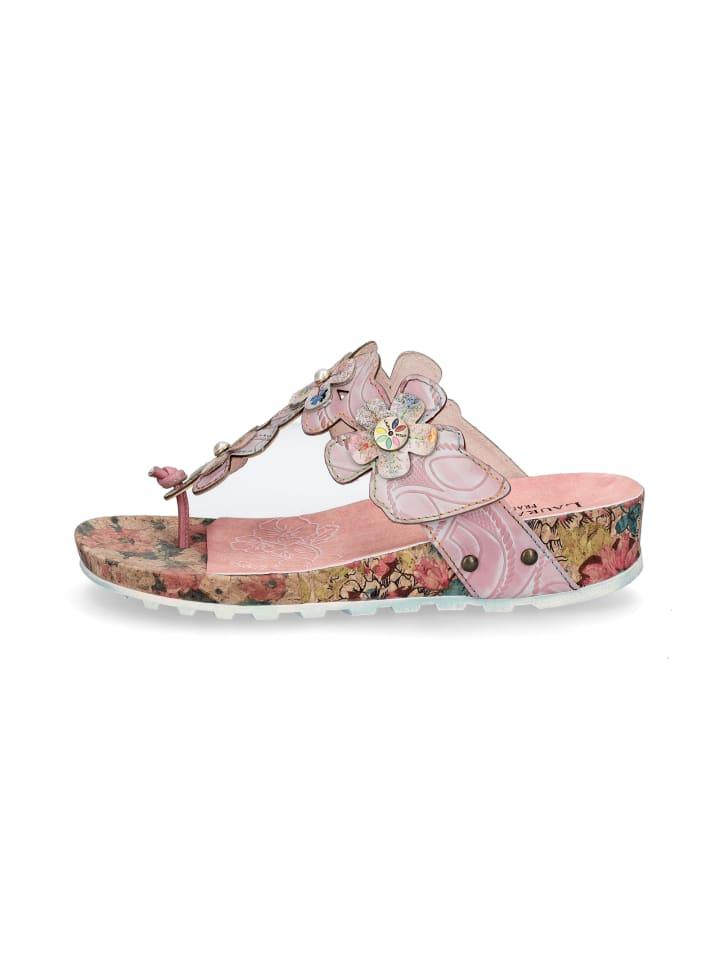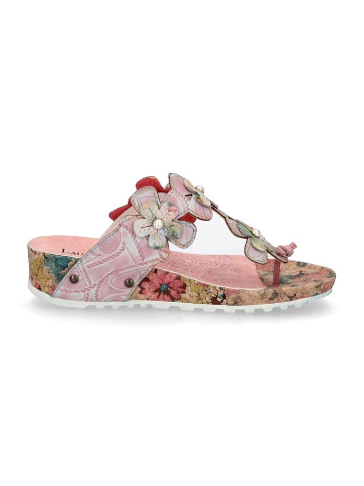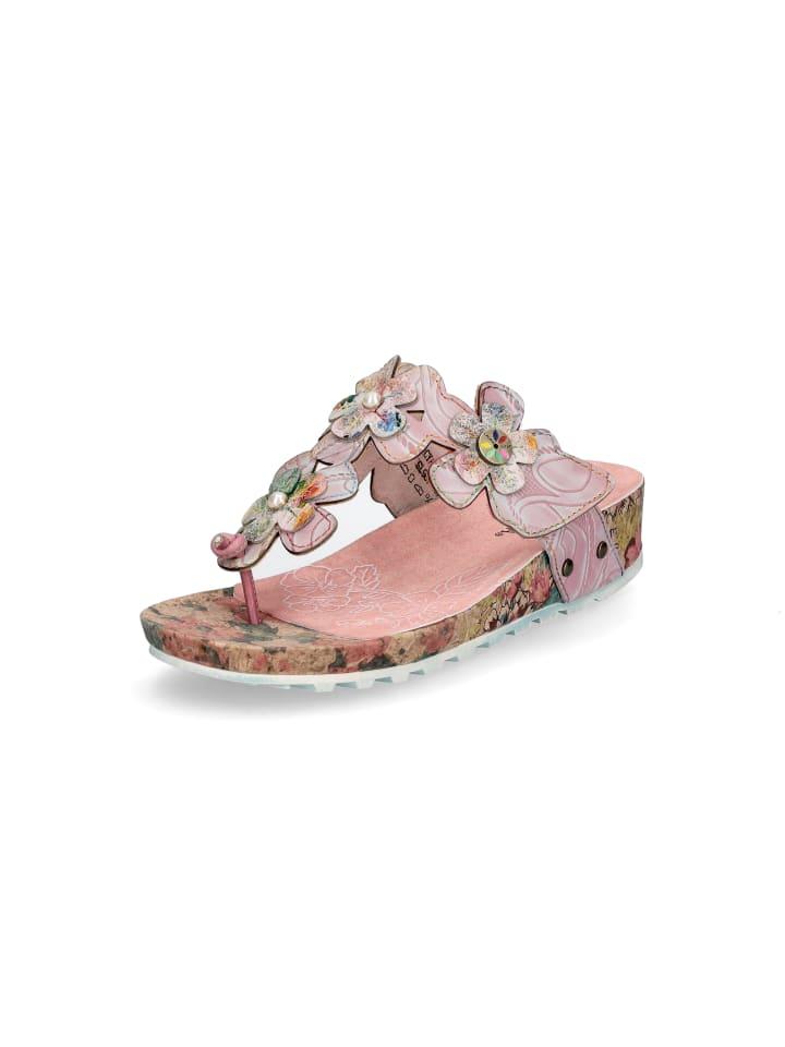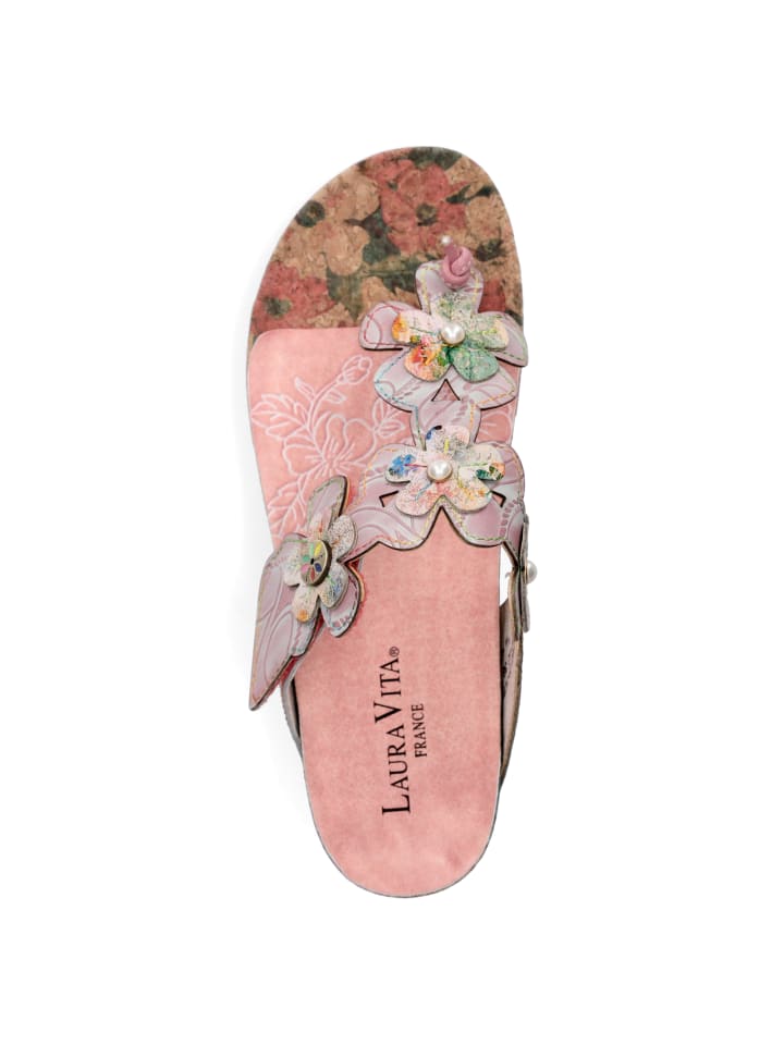 Женские розовые кожаные мюли Laura Vita с популярными цветочными аппликациями, танкеткой высотой 2,5 см и кожаной стелькой.