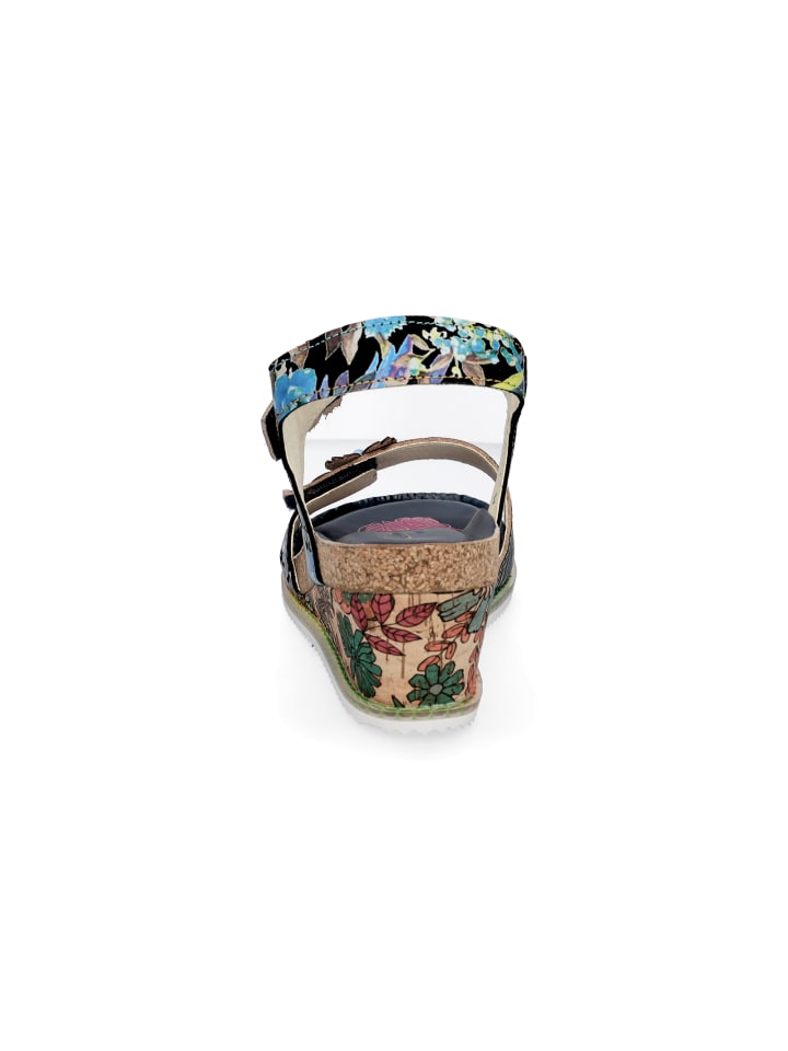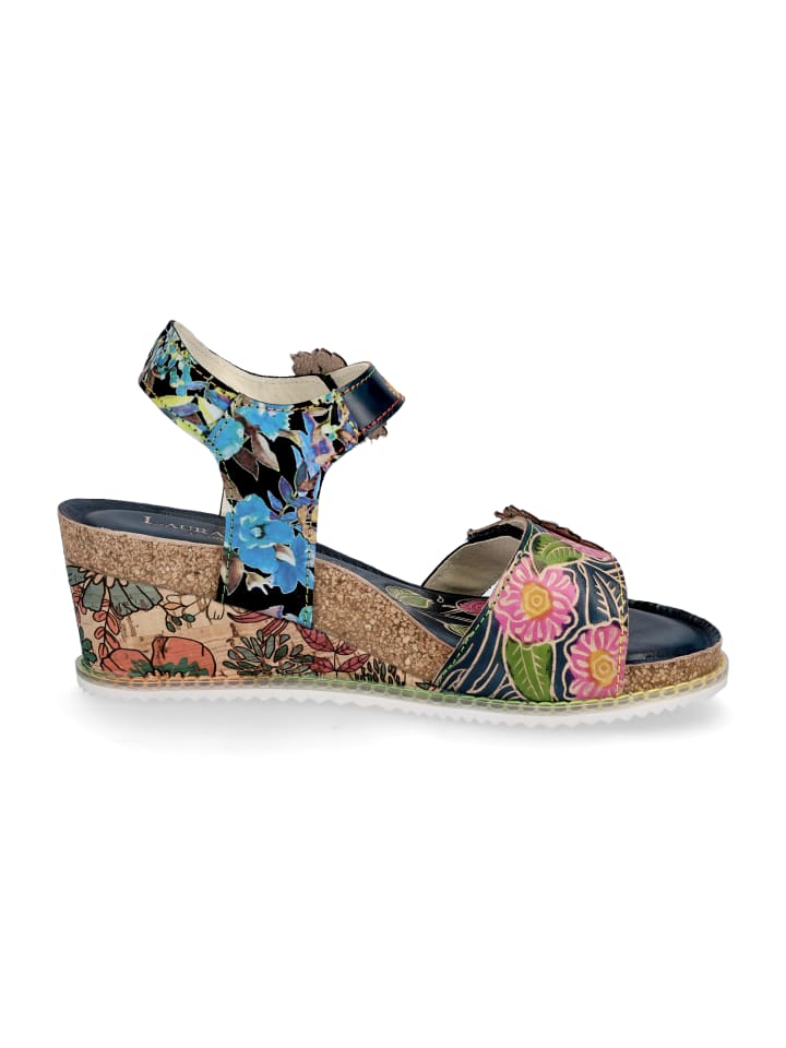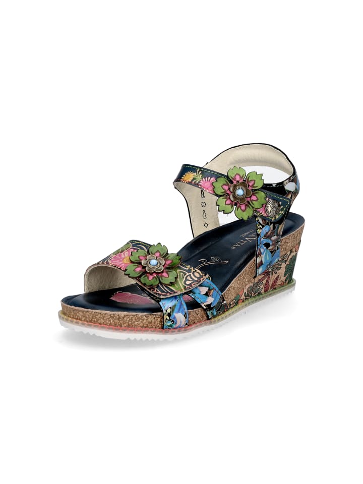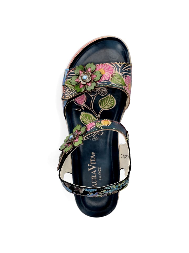 Женские босоножки Laura Vita из кожи джинсовой ткани со стильными цветочными акцентами, танкеткой высотой 6 см, застежкой на липучке и резиновой подошвой.