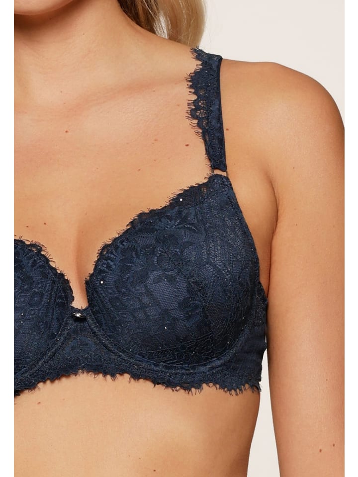Искрящийся синий! Этот формованный бюстгальтер с красивыми кружевными чашечками и блестками на ткани создает шикарный образ. Кружевные бретельки и стильная подвеска между чашечками делают бюстгальтер особенно элегантным.