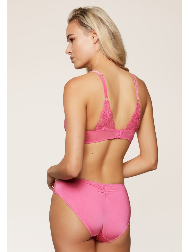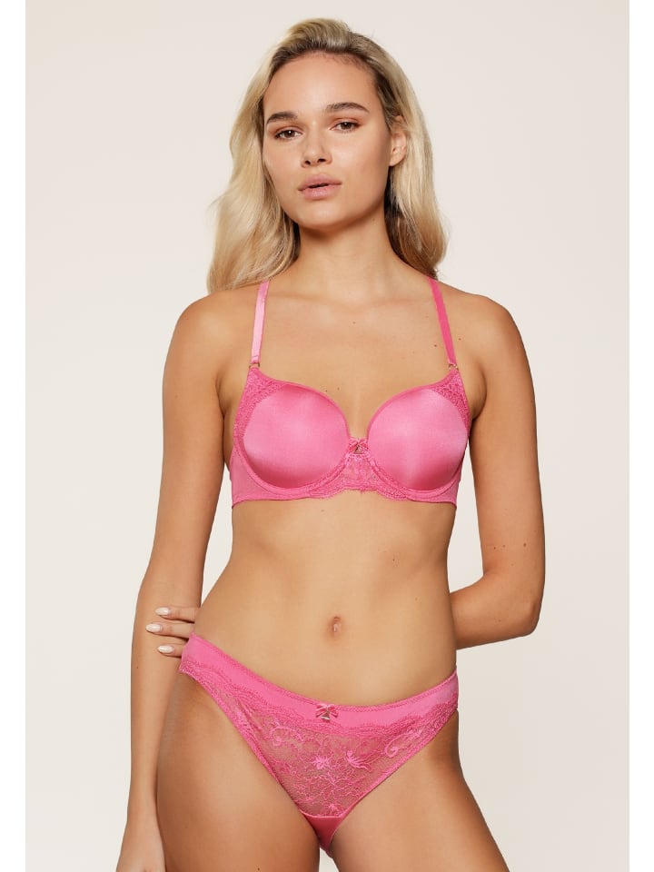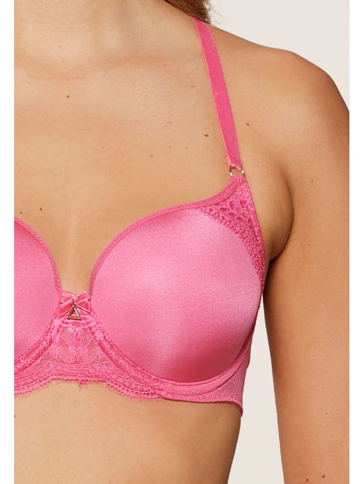 Pink Sensation! Этот гладкий формованный бюстгальтер украшен красивым кружевом по бокам чашек. Кружевные детали на бретельках сзади и бантик между чашками создают элегантный образ.