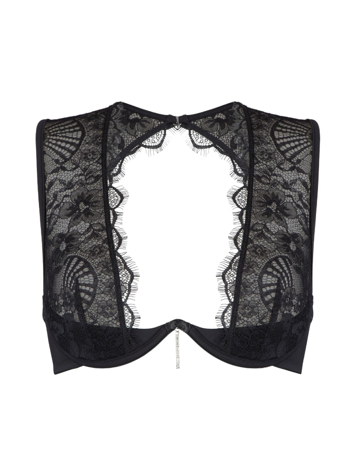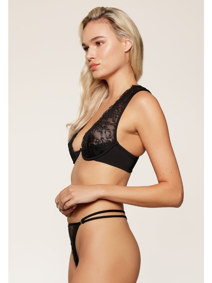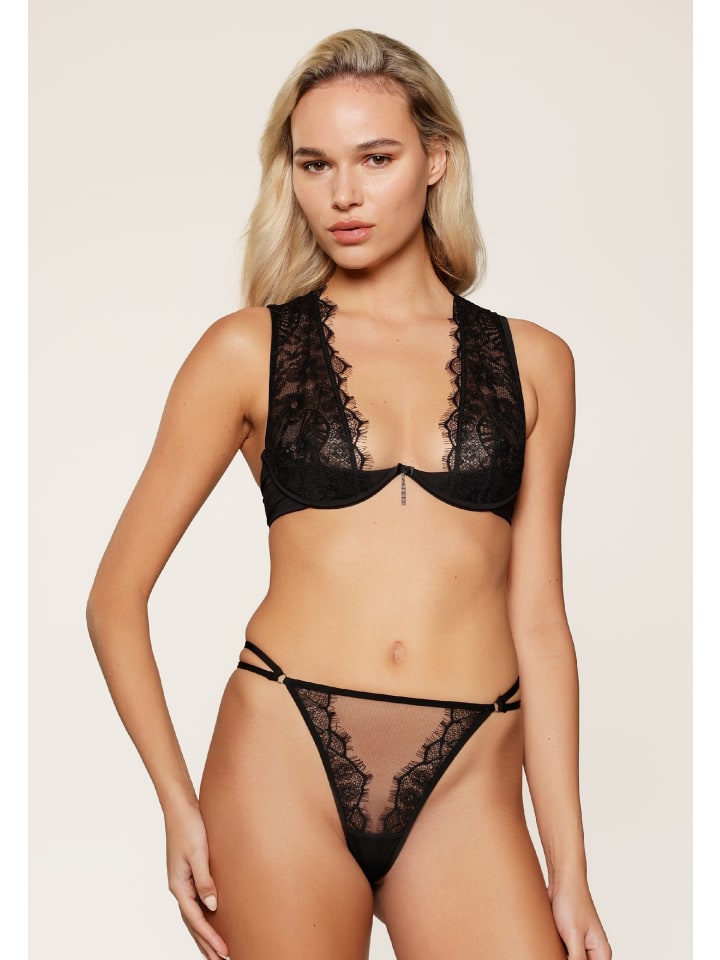 Black Boudoir. В этом прекрасном комплекте вы будете готовы к выходу в мгновение ока. Бюстгальтер обеспечивает легкую поддержку под грудью. Кружево проходит по груди до спины и расстегивается на застежку. Подвеска со стразами между чашечками придает комплекту особую элегантность. Стринги в комплекте полупрозрачны спереди и имеют две тонкие бретельки по бокам.