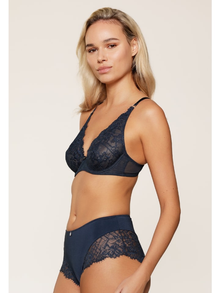 Искрящийся синий! Эти красивые трусики с высокой талией идеально подойдут тем, кто любит трусики с завышенной талией. Перед трусиков непрозрачный, а боковые и задние детали украшены красивой кружевной отделкой, что делает их одновременно стильными и сексуальными. Стильная подвеска спереди и мелкие блестки на кружевной ткани делают трусики особенно элегантными.