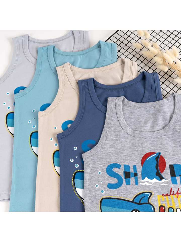 Откройте для себя нашу упаковку из пяти маек для мальчиков с ярким рисунком акулы.