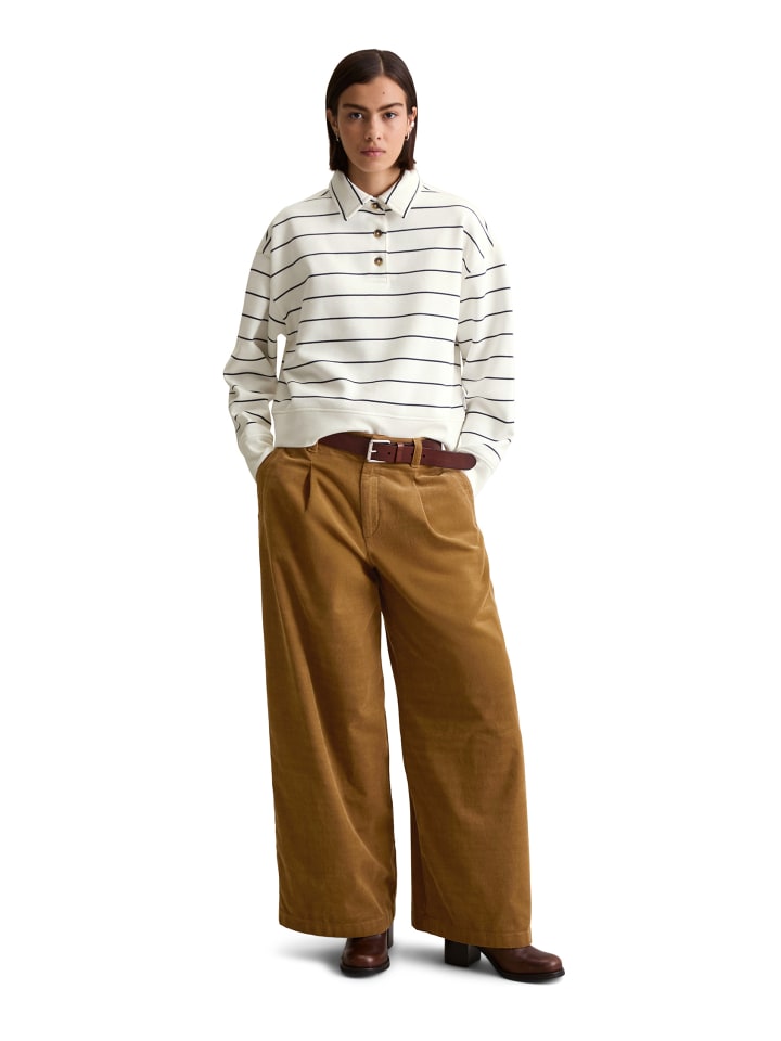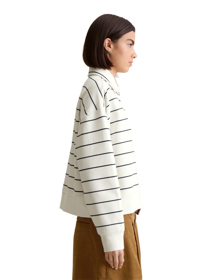 Новая стильная альтернатива классическому худи - полосатая толстовка-поло от Marc O'Polo DENIM. Это повседневный трикотажный свитер с воротником, ребристыми манжетами и планкой на пуговицах, который создает ультраспортивный, но в то же время элегантный образ. Совет: носите его с расстегнутой планкой на пуговицах, чтобы из-под нее выглядывала футболка, топ с длинными рукавами или полосатая блузка. Это добавит образу глубины и выразительности. Наша толстовка-поло изготовлена из чистого хлопка, окрашенного в пряже, с уютной подкладкой и имеет свободный укороченный крой со спущенными плечами.