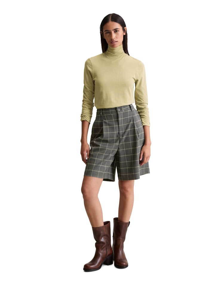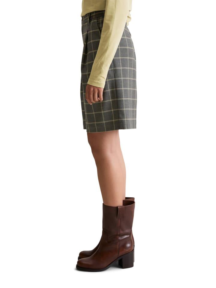 Широкие брюки сейчас очень популярны. Особенно эффектно смотрятся клетчатые брюки модной длины бермуды. Эти короткие широкие клетчатые брюки от Marc O'Polo DENIM - настоящая находка, которая идеально сочетается с блузками, пальто и короткими свитерами. Наша модель отличается широкими брючинами, стандартной линией талии, свободными складками, двумя практичными косыми карманами спереди и прорезным карманом сзади. Они изготовлены из высококачественной, окрашенной в пряже, переработанной эластичной полиэстерово-вискозной ткани с эффектом шерсти. Совет: сочетайте с водолазкой, короткой стеганой курткой, гольфами и лоферами. Для создания модного и стильного образа наденьте подходящий жилет.