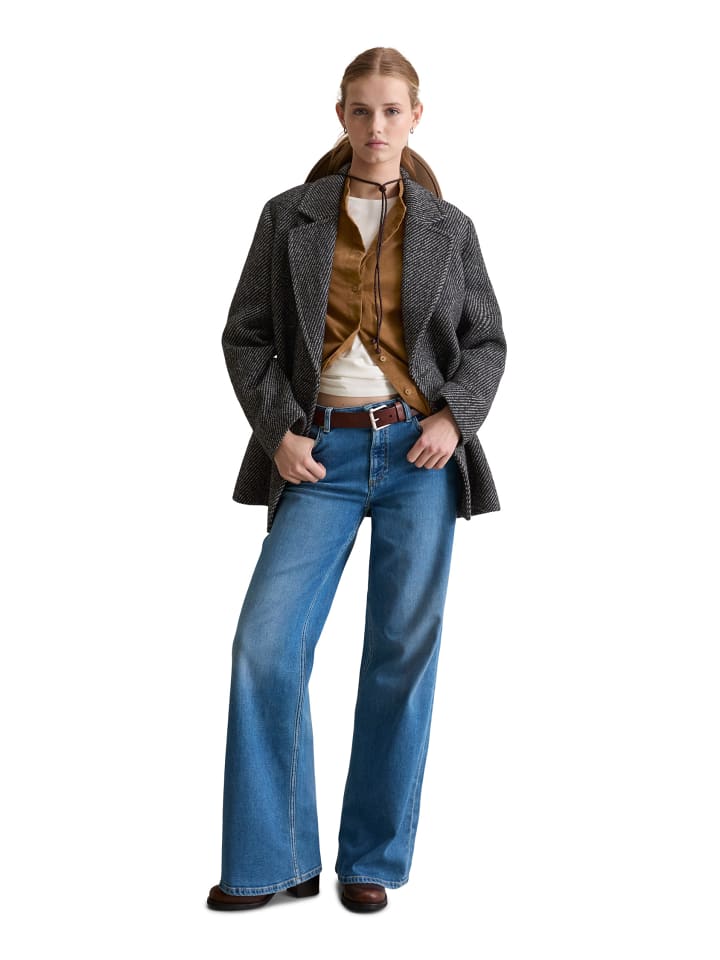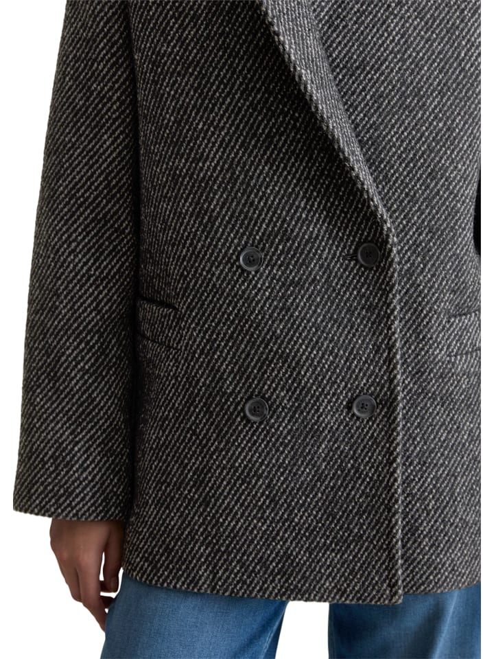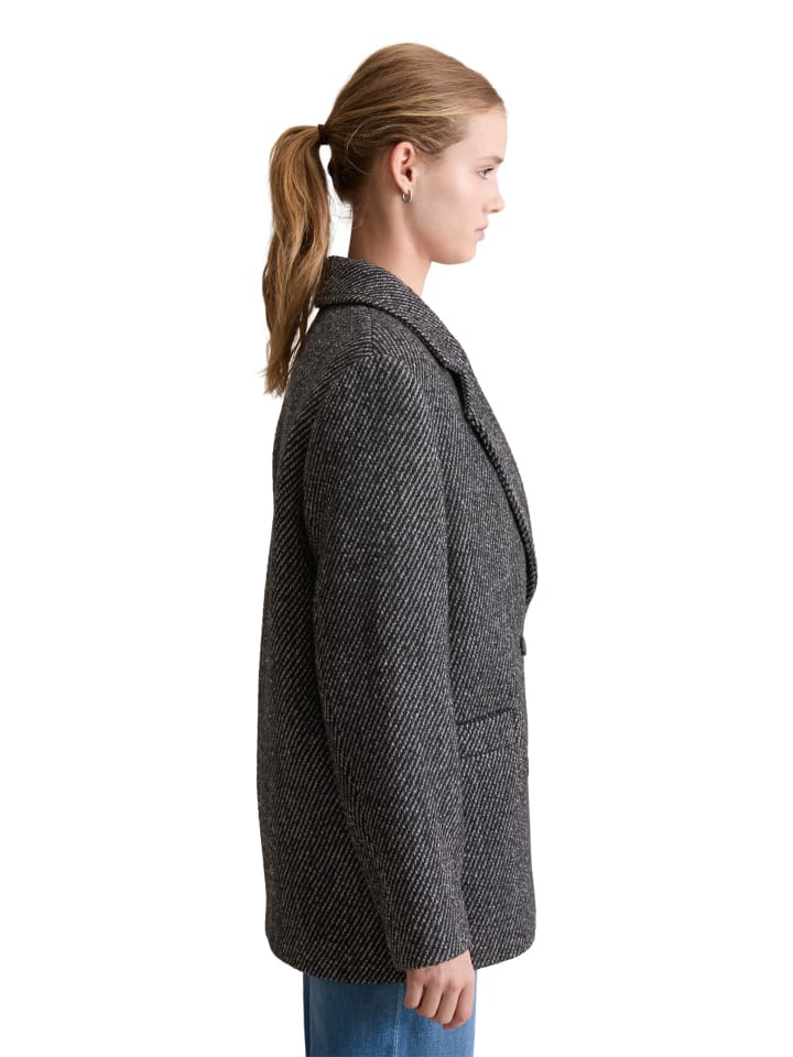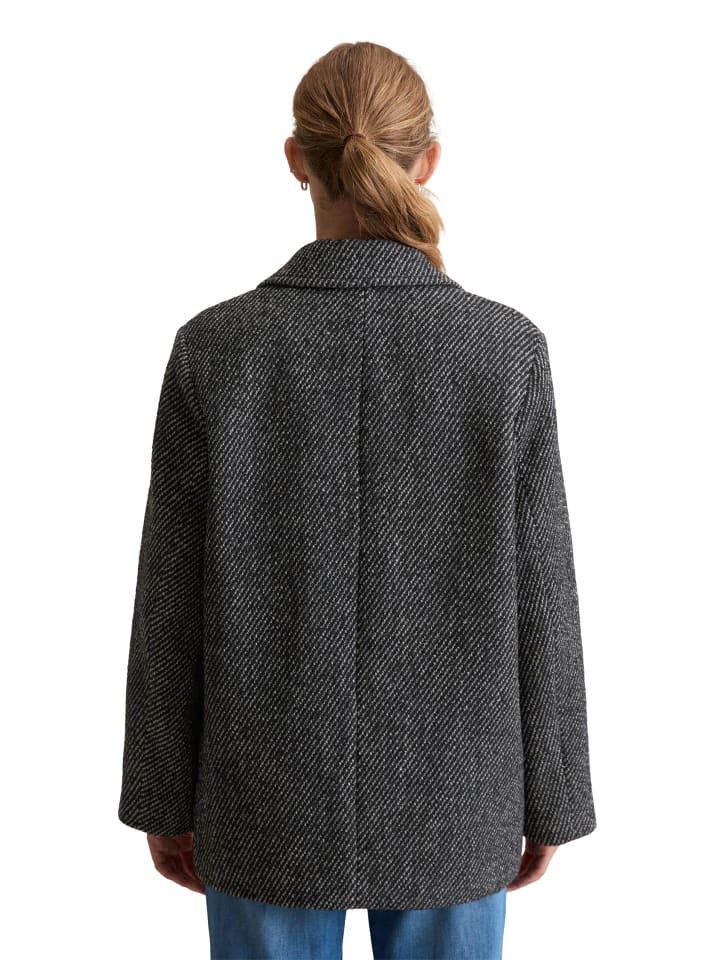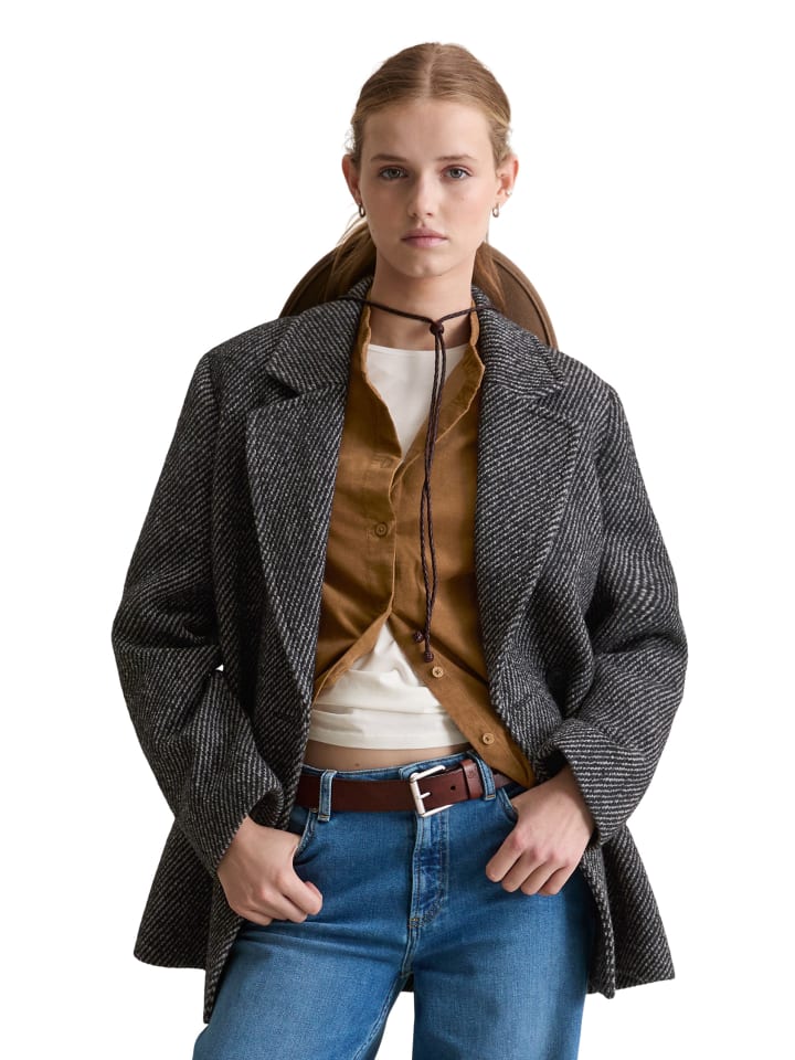 Элегантный фактурный твид из высококачественной шерстяной смеси, а также непринужденный дизайн блейзера - все это наш осенний выбор. Мужской шик привносит нотку свежести в гардероб и прекрасно сочетается с плиссированными юбками или спортивными брюками. Двубортный блейзер свободного кроя имеет слегка спущенную линию плеч, широкие лацканы и два прорезных кармана. Пиджак полностью на подкладке.