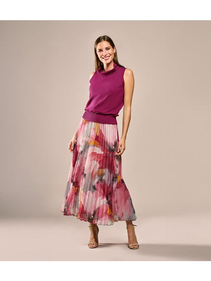 Юбка Norita Print - это подчеркнуто женственная плиссированная юбка, в которой гармонично сочетаются принт, блеск и движение. Графичный цветочный принт тонко дополнен блестящей пряжей бронзового цвета, что придает юбке изысканный и роскошный вид, не перегружая ее. Мягкая, струящаяся ткань и изящные складки создают изящный силуэт, который элегантно струится и непринужденно подчеркивает фигуру. Юбка из комфортного трикотажа с добавлением полиэстера и люрекса отлично держит форму и приятна к телу. Благодаря эластичному поясу юбка Norita идеально садится по фигуре, не жертвуя комфортом. Этот универсальный дизайн, неподвластный времени, мгновенно добавит вашему образу стильности и уверенности.