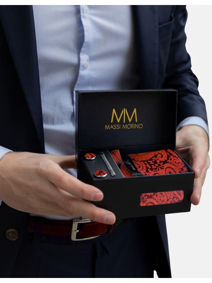 Наши модели Massi Morino разработаны в Германии и созданы исключительно с учетом пожеланий наших многочисленных клиентов. Наши подарочные наборы для мужчин - бестселлеры в категории галстуки и бабочки по всей Европе. Мужские аксессуары Massi Morino - от галстуков и нагрудных платков до дизайнерских бабочек и подтяжек из натуральной кожи - уже давно считаются хорошим вкусом. Подарочный набор 5 в 1: галстук с нагрудным платком, запонки и зажим для галстука, включая пошаговую инструкцию по завязыванию. Галстук: длина 147 см, ширина 8 см.
