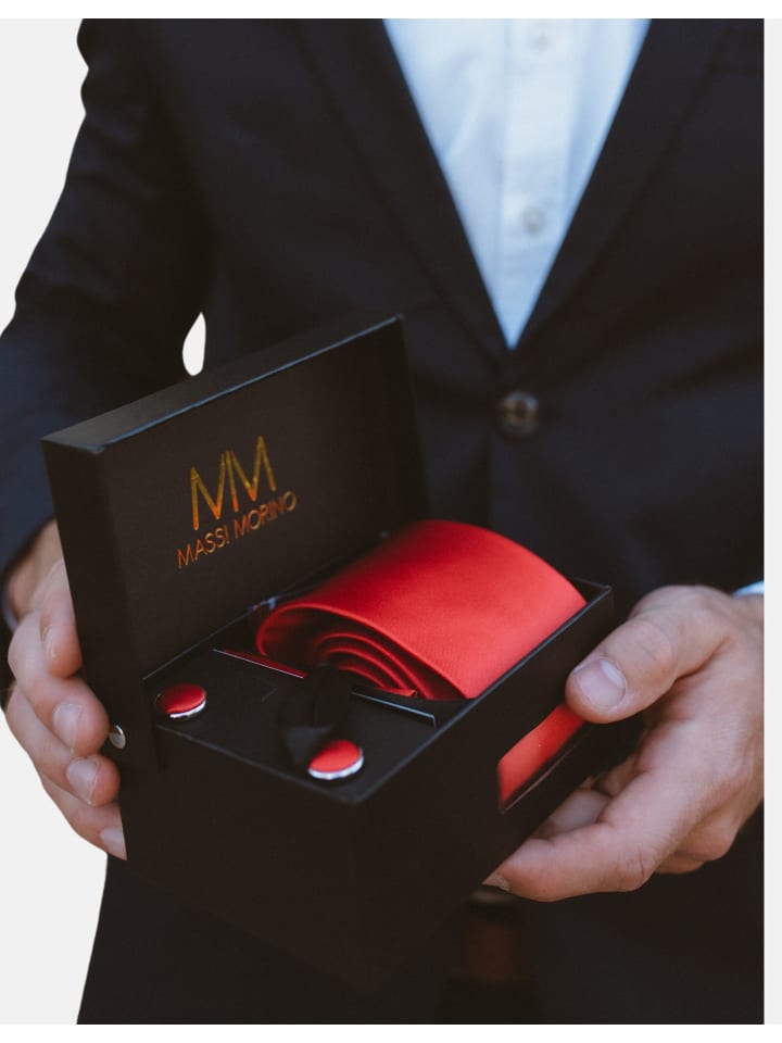 Наши модели Massi Morino разработаны в Германии и созданы исключительно с учетом пожеланий наших многочисленных клиентов. Наши подарочные наборы для мужчин - бестселлеры в категории галстуки и бабочки по всей Европе. Мужские аксессуары Massi Morino - от галстуков и нагрудных платков до дизайнерских бабочек и подтяжек из натуральной кожи - уже давно считаются хорошим вкусом. Подарочный набор 5 в 1: галстук с нагрудным платком, запонки и зажим для галстука, включая пошаговую инструкцию по завязыванию. Галстук: длина 147 см, ширина 8 см.