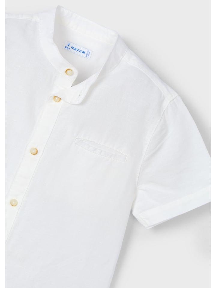 Рубашка Mayoral для мальчиков с короткими рукавами - идеальный выбор для праздничных случаев и элегантных образов. Изготовленная из высококачественного хлопка с добавлением льна, она одновременно выглядит привлекательно и очень комфортна. Практичная застежка на пуговицы и современный воротник-мао делают эту рубашку стильным дополнением к торжественным случаям. В сочетании с подходящими брюками и обувью ваш маленький джентльмен всегда произведет неизгладимое впечатление в этой рубашке. Незаменимая вещь для праздничных случаев.