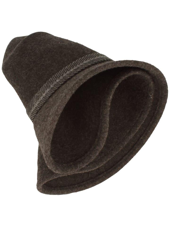 - Элегантная и практичная дорожная шляпа-чемодан из слегка пестрой шерсти с узкой отделкой из шерстяной ткани с тонким узором.