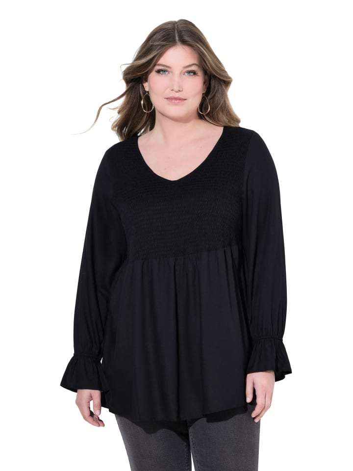 Блузка А-силуэта из мягкой вискозы с присборенным лифом и эластичной сборкой на груди. V-образный вырез, длинные рукава с эластичным подолом.