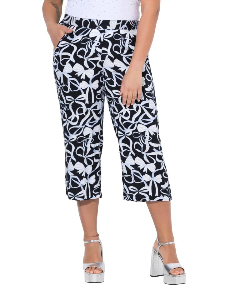 Брюки-кюлоты свободного кроя, длиной примерно до икры. Изготовлены из мягкой вискозы с узором бантик, поясом на частичной резинке и боковыми карманами.