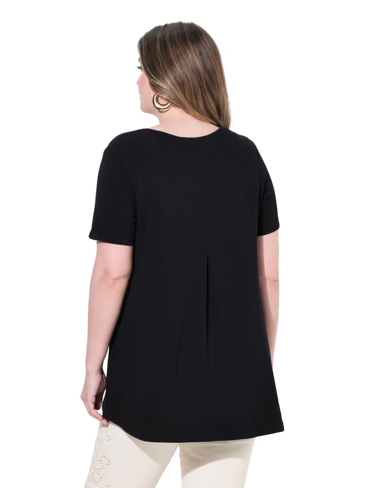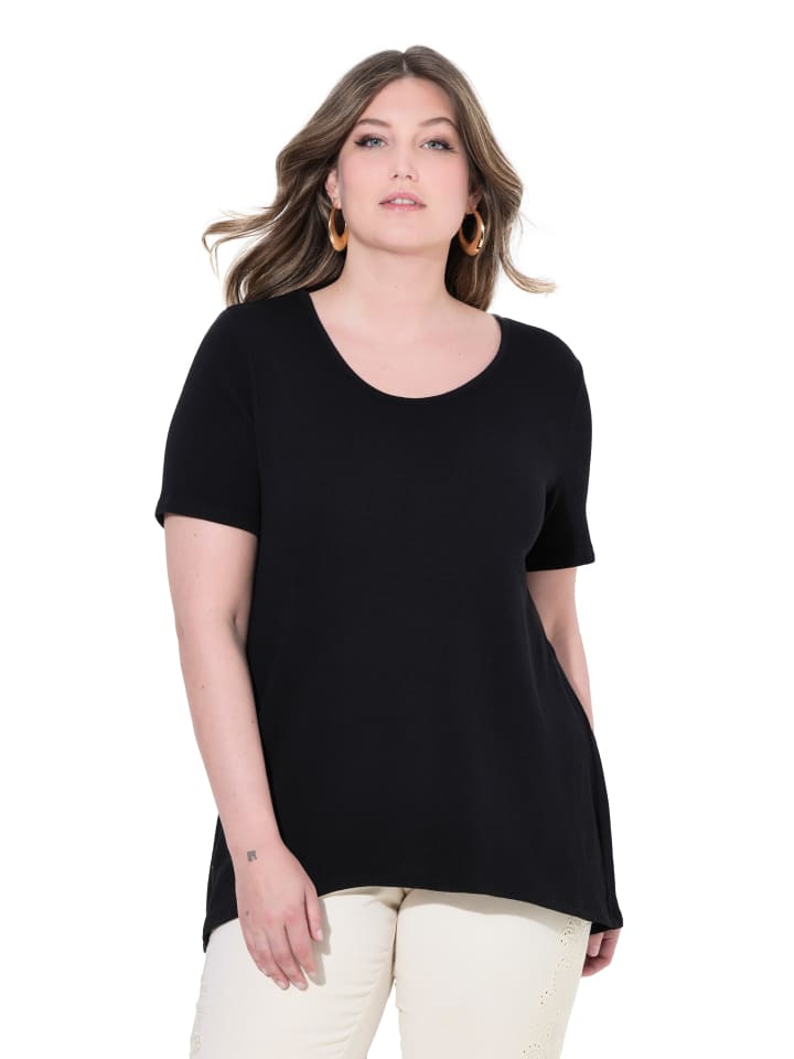Трикотажная рубашка А-силуэта с широким подолом, выполнена из мягкого, хорошо сохраняющего форму тонкого трикотажа. Круглый вырез горловины, короткие рукава. Декоративная складка сзади.