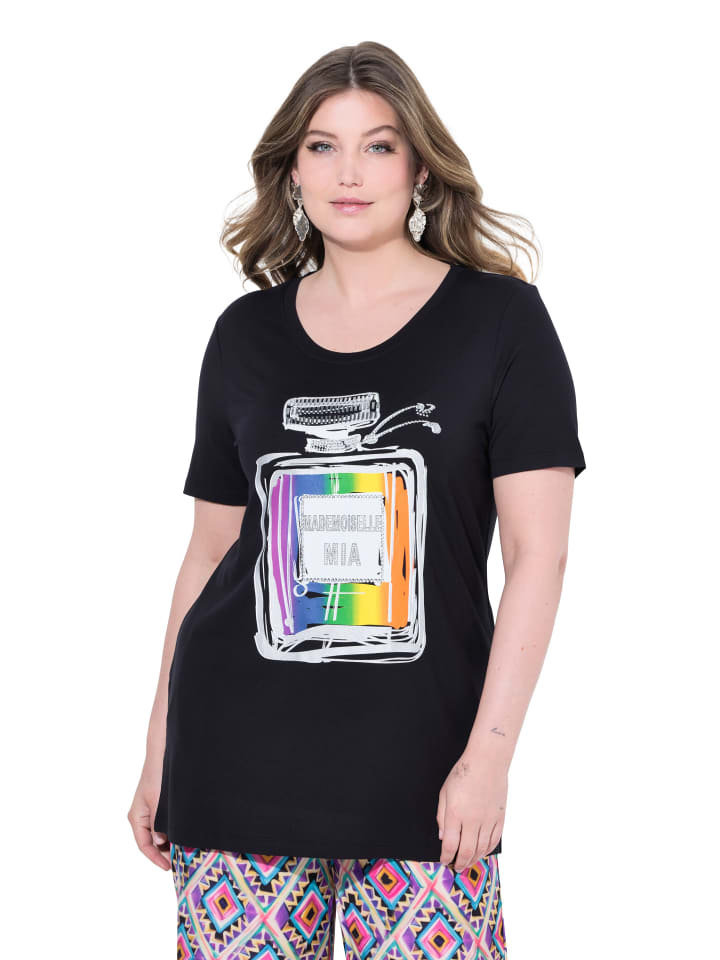 Футболка А-силуэта из мягкого трикотажа с блестящими камнями на бутылке. Круглый вырез, короткие рукава.